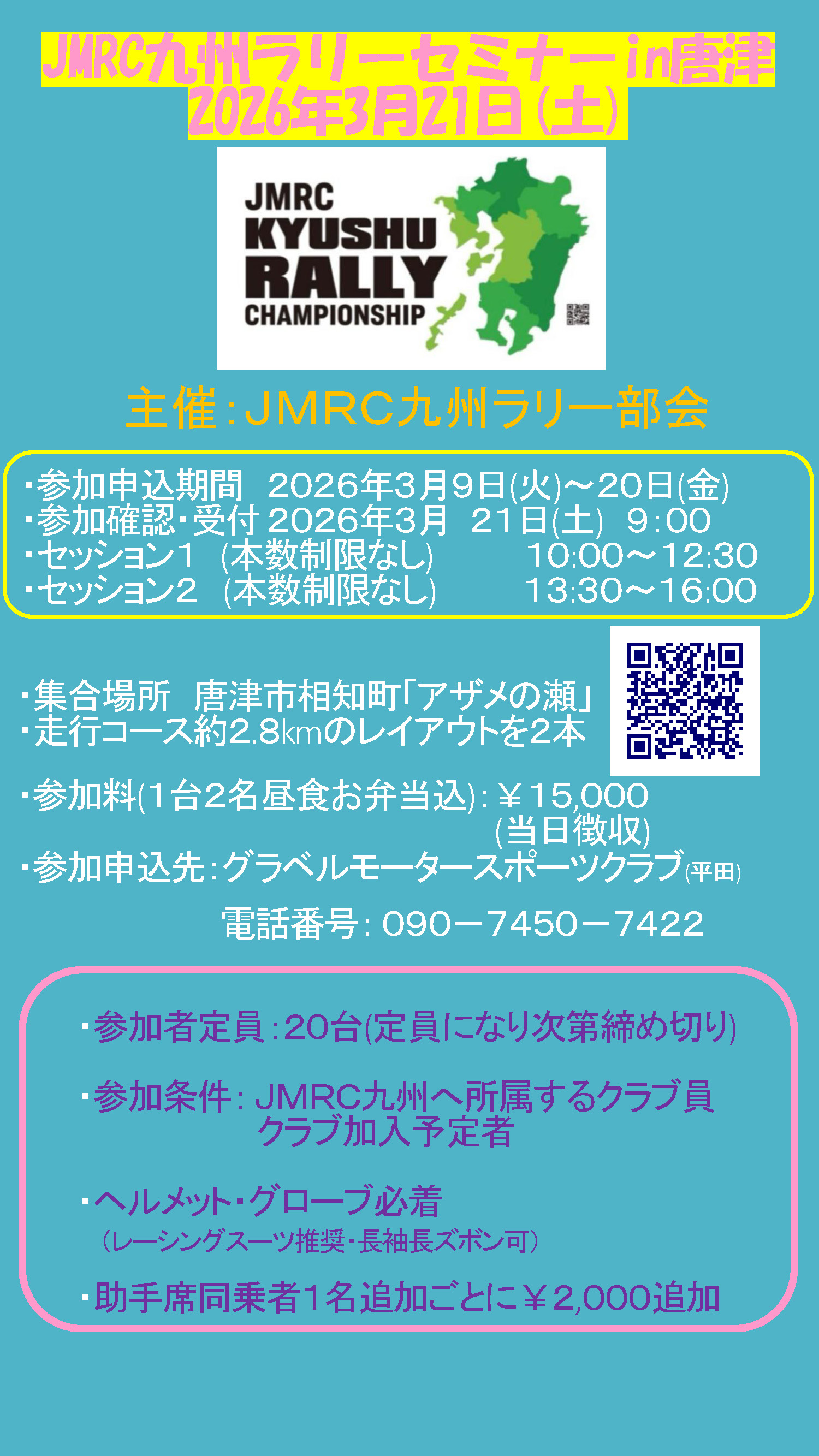 2026/3/11![]() 2025/4/2 ☆【再連絡】RH1リストリクターについて 2025年より JAF九州ラリー選手権 JMRC九州ラリーチャンピオンシリーズ におけるRH1クラス車両のリストリクターは 計測と封印の 「再施工」が必要です。 封印シリアルの管理一元化も見直しするため、 再度の計測と封印の施工にご協力ください。 2025/3/20 ☆『JMRC九州ラリー選手権ファンサイト』開設 ●『JMRC九州ラリー選手権ファンサイト』開設のご案内 ![]() 2025/1/23 ☆共済について JMRC九州事務局からのお知らせにもありますが、 「2025 年度 JMRC九州共済・スポーツ安全保険について」をご一読いただき、 JMRC九州共済加入+スポーツ保険加入を行って下さい。 ☆RH1リストリクターについて RH1クラスのリストリクター装着必須に伴い、封印を行います。 徳尾モータースにて行っておりますので、 送っていただくか、持込されて封印を行って下さい。 徳尾モータース 〒804-0082 北九州市戸畑区新池2-5-37 徳尾モータース TEL:093-881-3933 ※元払いにて発送していただき、封印後、着払いにてお戻し致します。 ☆現在、JMRC九州ラリー専門部会ホームページ(ファンサイト)を企画中。 ☆ラリー競技会参加に関する特約の一部改定 ラリー競技会参加に関する特約の加入条件が改定されました ●ラリー特約の一部改定 ●ラリー特約申込書 ☆九州ラリー競技に関するお知らせ 2007年より九州ラリー競技において「緊急時、後続車への合図の為に 規定の『OK』『SOS』マークの入ったボードを各自用意しなければならない。」となりました。 ●ダウンロード |
